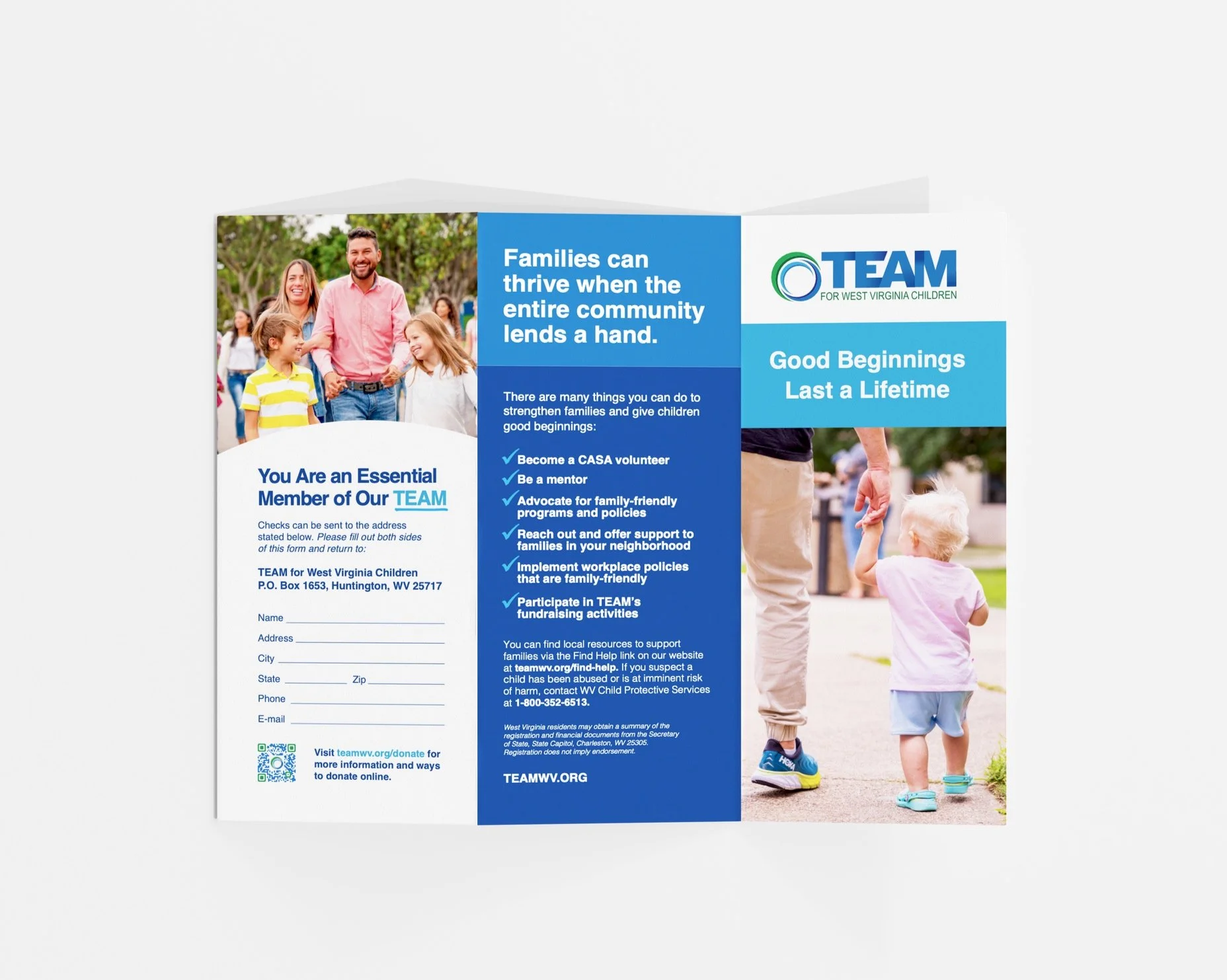 Print materials and graphics created for TEAM for West Virginia Children with 84 Agency. Packet and social graphics were created for West Virginia’s legislative session in 2023. Brochure was created for general promotion of TEAM and TEAM programs.